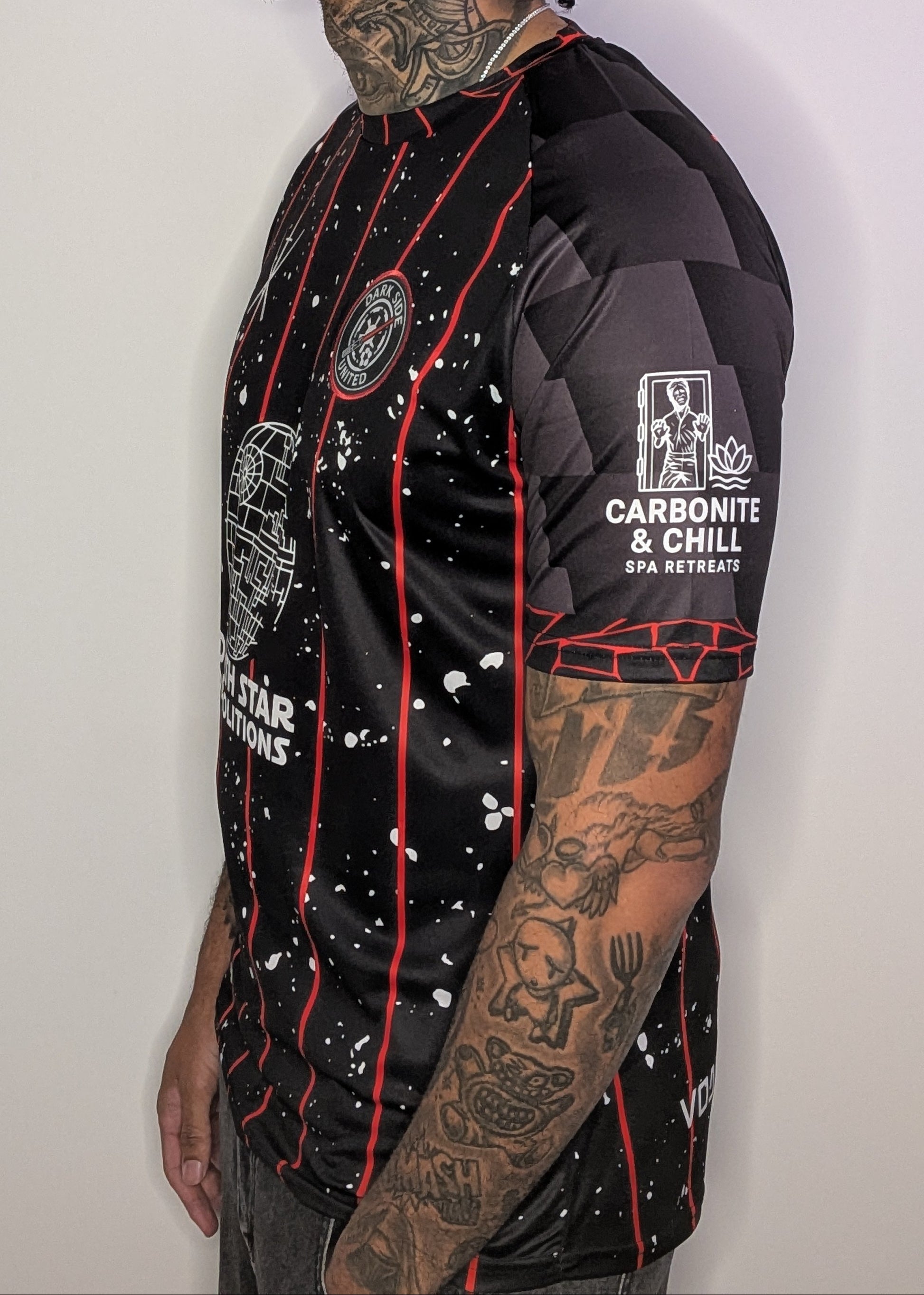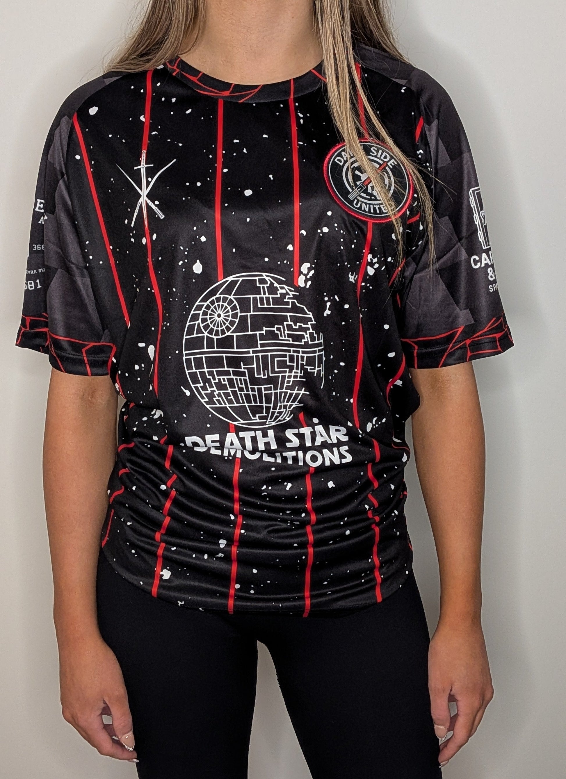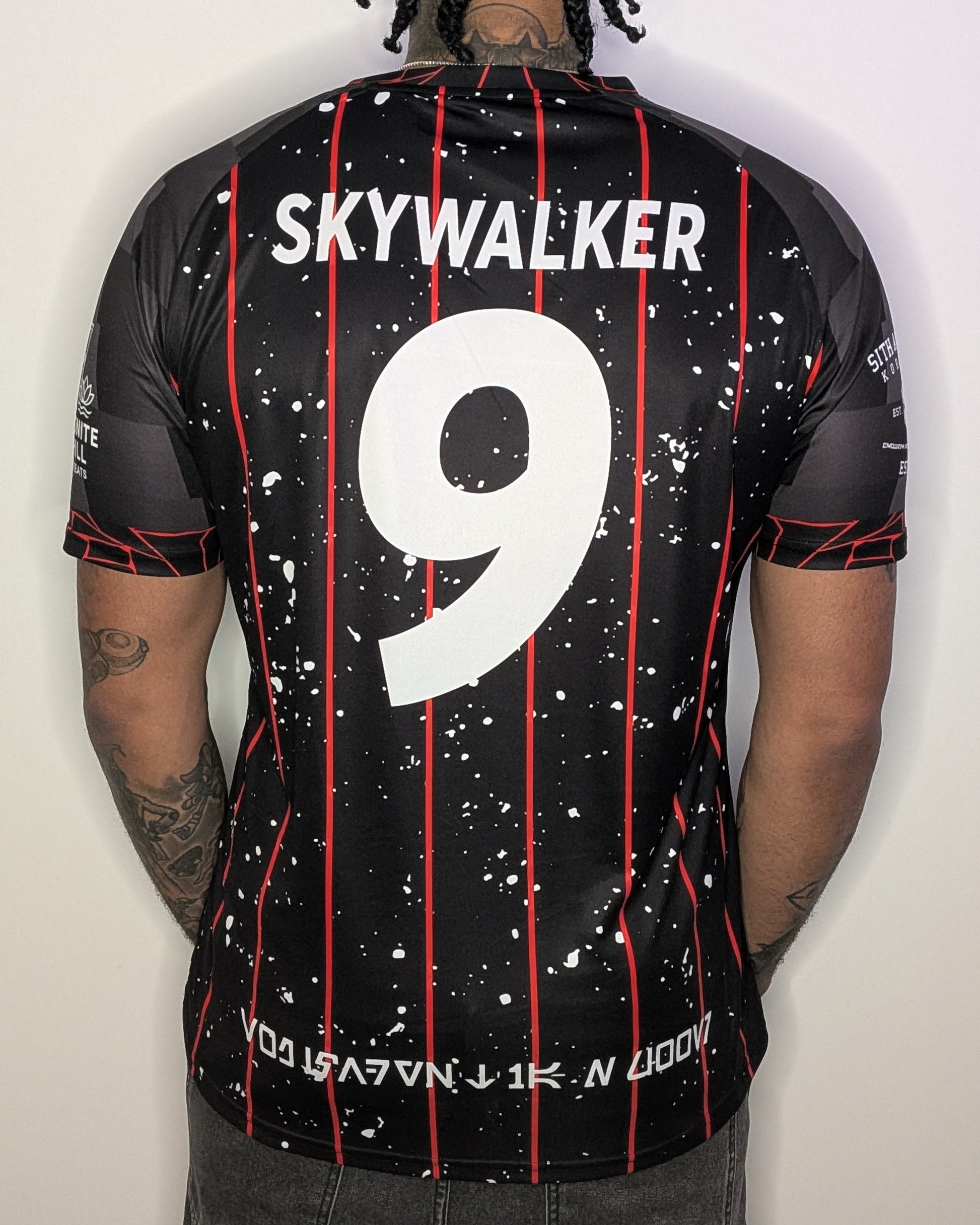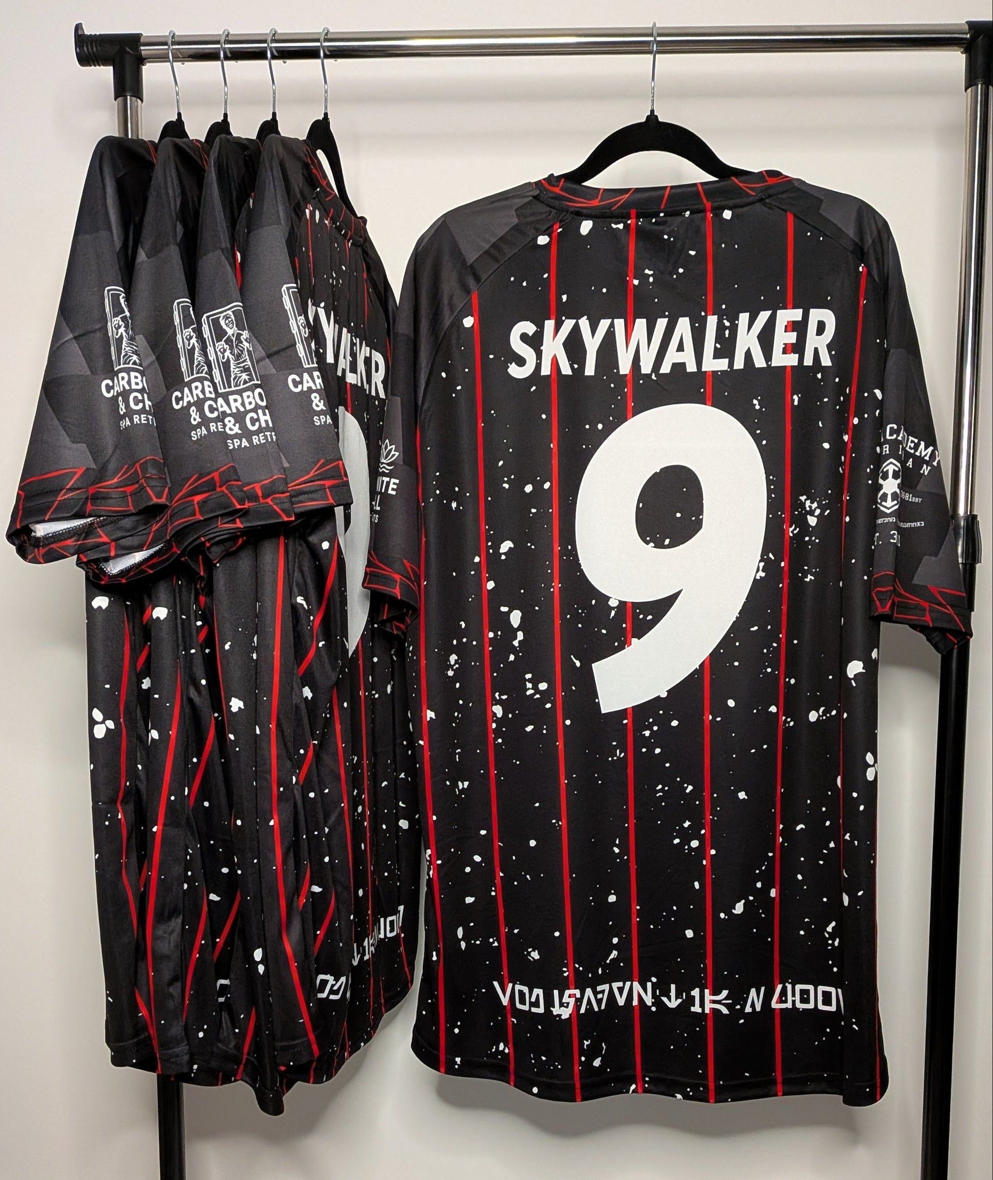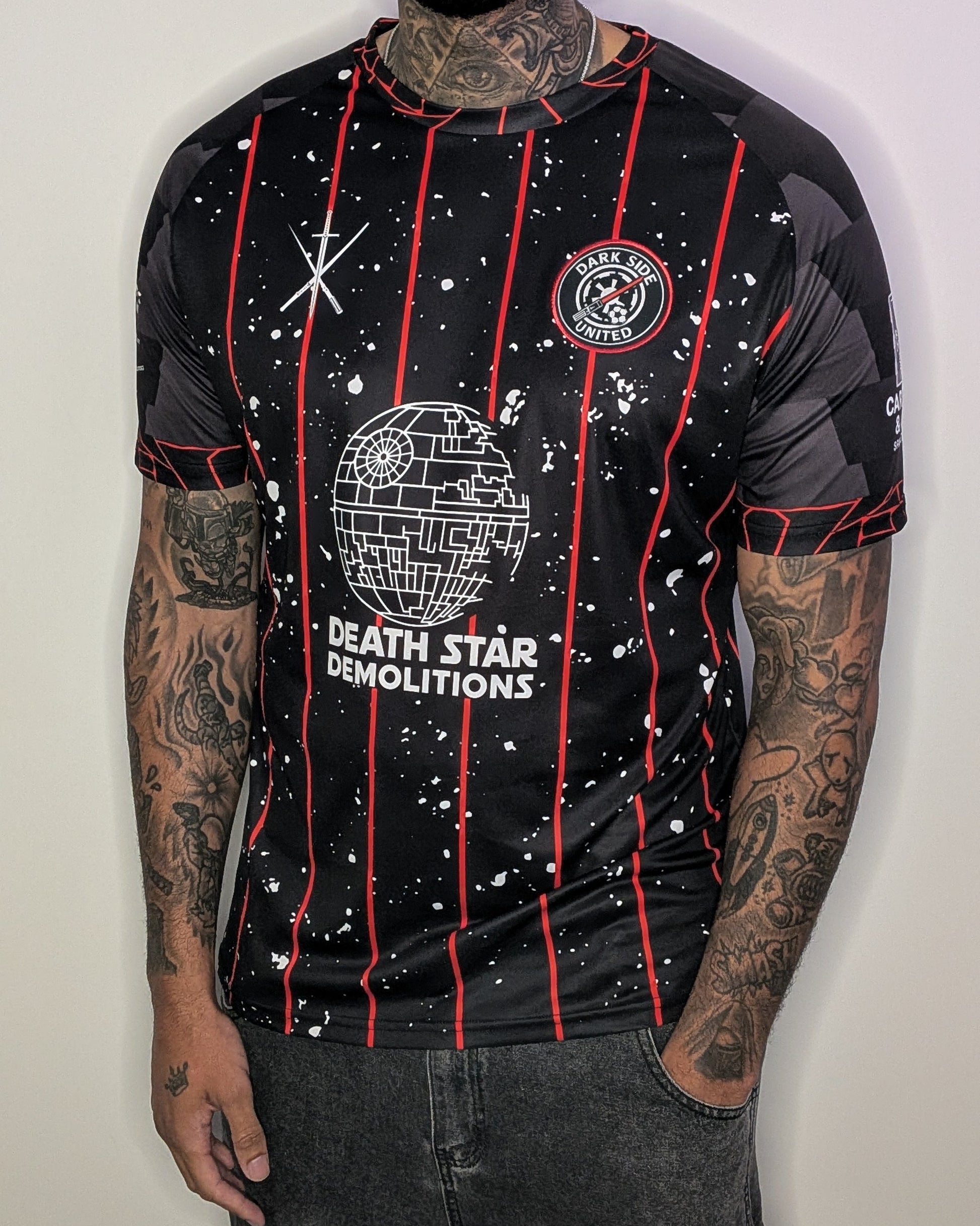 Elevate your inventory with the Skywalker Black Football Top, crafted from 100% polyester for lightweight comfort and durability. Featuring the iconic Death Star centred in the middle, this top blends style with the dark side. . Made by fans with attention to detail, this shirt is perfect for fans who would do anything for their loved ones.