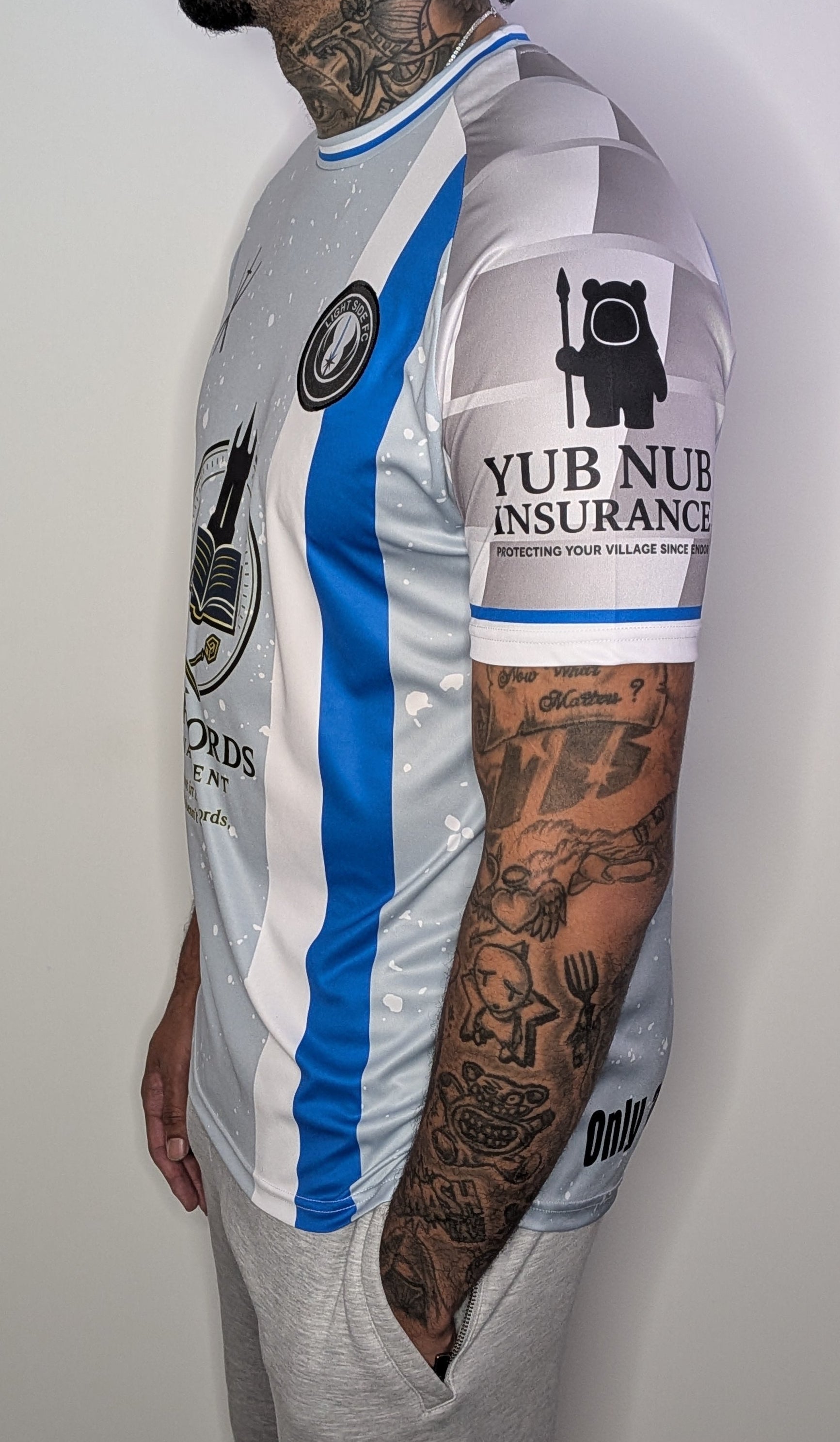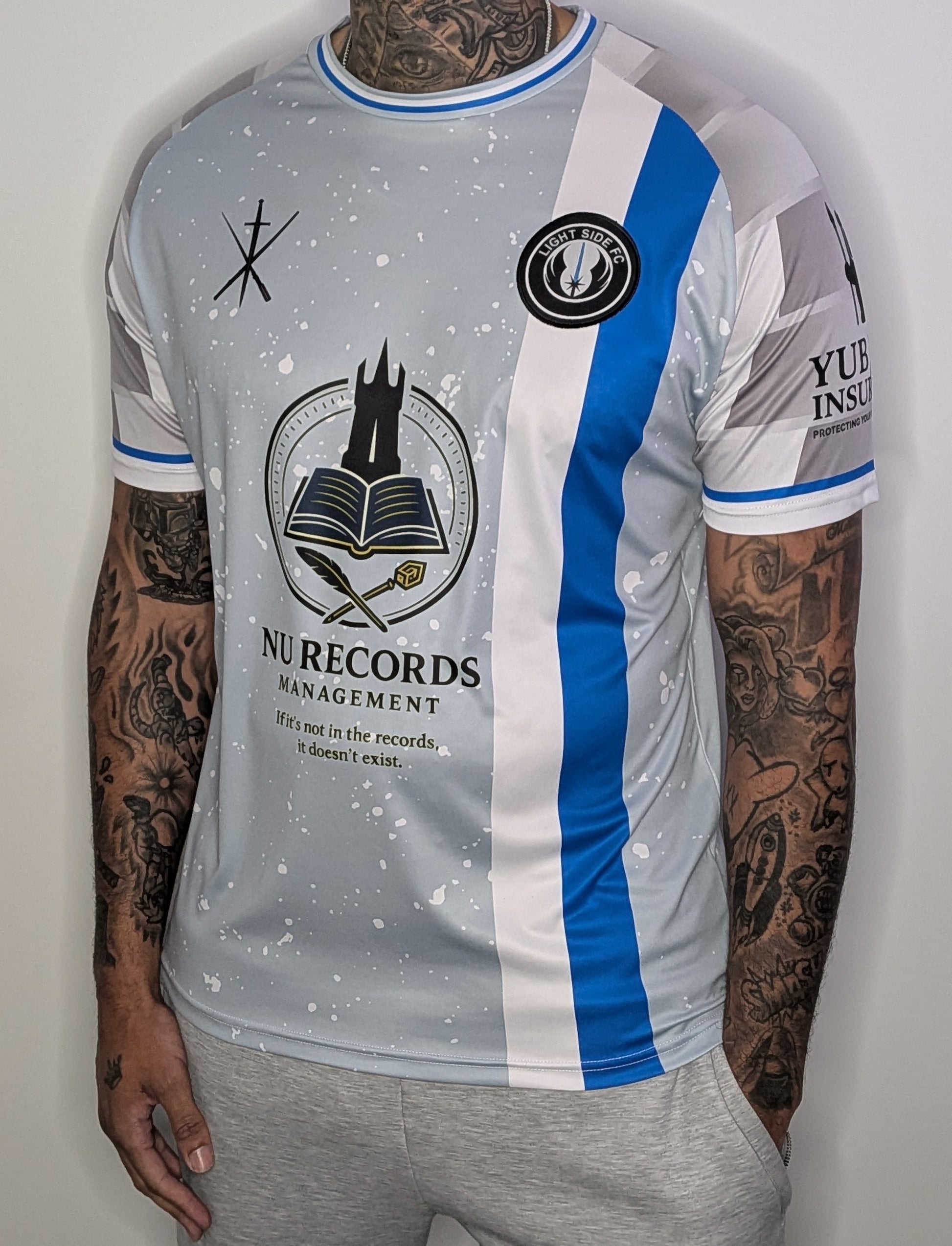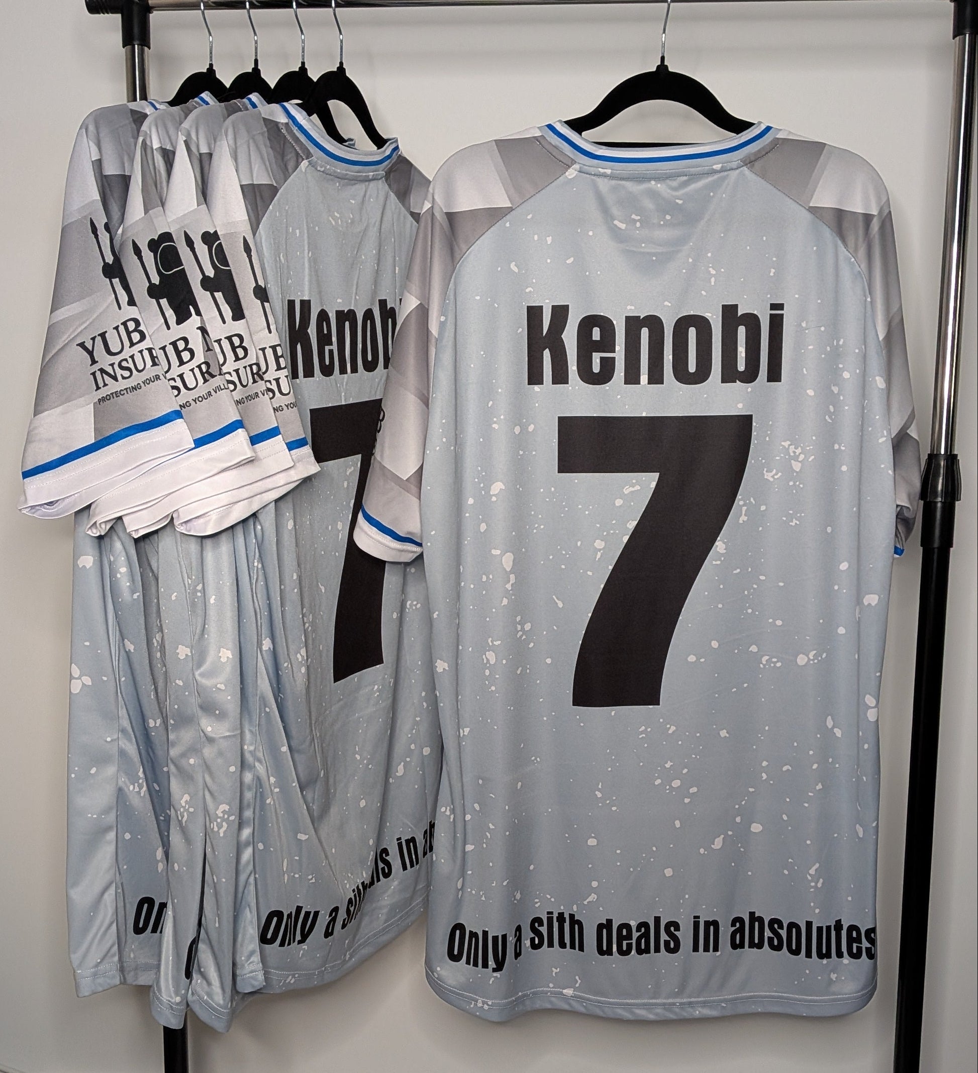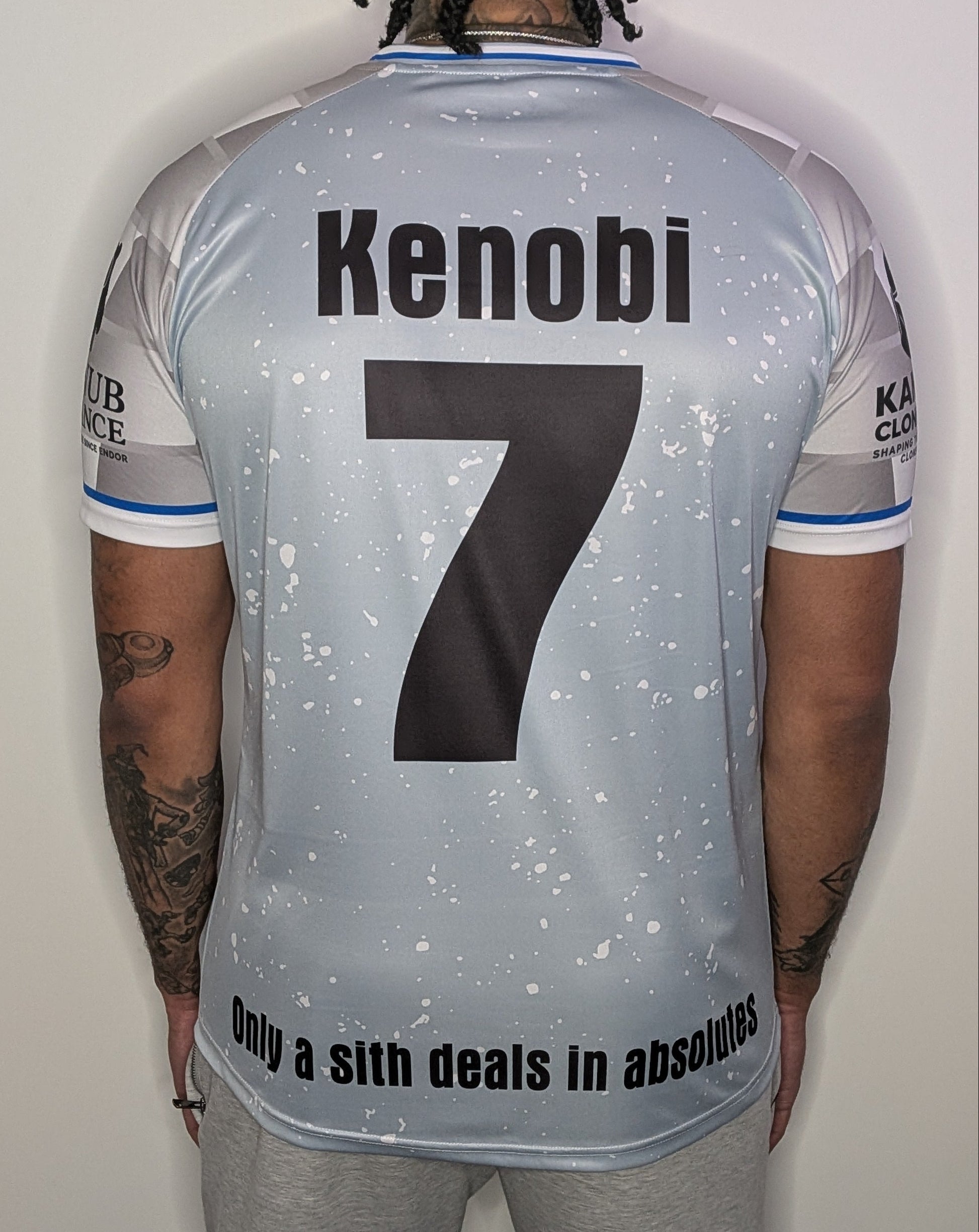 Built on firm foundations. This white jedi inspired football top marks the beginning of the clone wars, with shapes, textures and colours borrowed from its long and storied history. Created to be worn at the legendary battle of Genesis. Comfortable, practical and an embroidered club crest for unmatched pride. A top Cpt Rex would be proud to wear.